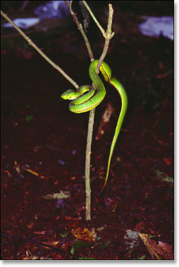 The green tree viper, Trimeresurus cf. stejnegeri. This snake holds itself absolutely still for hours in a ready position, waiting for prey to come within striking distance. Green tree vipers eat small vertebratesfrogs, birds, small rodentsanything that comes within range. They have red tails that they may use as bait. Their fangs secrete venom that immediately immobilizes their prey. They will strike offensively when threatened, especially when cornered. [Photo by: Raoul Bain] |