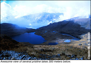 Don Renaldo led the slow back-and-forth switchback trail upwards. To hell with it, I thought. It'd take less time to go straight up. "Mas directamente," I said to Don Renaldo. "Si", was the response I got, and an "Arriba!" It took all of my strength and lung capacity to stay with him. We reached the high Incan Camino at about 3950 meters, where Don Renaldo turned and seemed pleased that I was still with him. With some satisfaction I crumpled to the ground. "Dos minutos, por favor," I implored. "Talves cinqo," he laughed. Yes, I thought, five would be lovely. Along the Incan trail, which has a more gradual incline, suddenly Don Renaldo stopped in his tracks, crouched and motioned for me to do the same. Ahead were about a dozen viscacha, small mammals that look a bit like a cross between a rabbit and a squirrel. They'd heard us and bounded their way beyond the next ridge. "Rapido," he whispered, "pero tranquillo." As we quickly headed up to the ridge (trying not to breathe too loudly) I dug for my camera and set it to rapid fire. When we disturbed them again over the crest I fired off about six shots before they scattered once more. We were nearing the pass and my pace was slowing steadily. I checked my watch. Ahead of schedule - good. One last push, my heart pounding so fast I could feel it against my sternum. Just as I thought my eyes were going to pop out of my skull or blood would spurt from my ears we arrived at the top. The pass itself was no more than a knife-edge positioned between two rocky peaks. The summits of these two couldn't have been more than another 15 or 20 meters. Down the other side, maybe 300 meters below, lay seven extraordinary blue and green lakes of varying sizes scattered across a plateau, each of them shining back at me, beckoning me in the still low morning light.