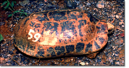 This rare Elongated tortoise (Indotestudo elongata) is one of the confiscated turtles rescued by the Turtle Conservation and Ecology Project at Cuc Phuong National Park in Viet Nam. Eventually it will be returned to suitable habitat in the wild. [Photo by: Nguyen Quang Truong/IEBR] |