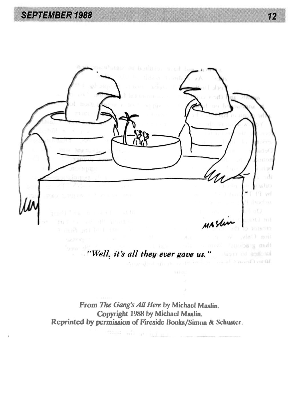 ![]() by Lory Lazaarus Michael Maslin, artist and creator of this cartoon, is a cool guy. Through the genttle prodding of our editor, I was enticed to track down the elusive Mr. Maslin. He's cool. I also think he's a closet turtle person. After all, how many normal people dream about two Galápagos tortoises in a zoo with the zookeeper handing them a phone to them saying, Its a call from the Galápagos? Michael Masliin did. He even made it into a cartoon. But no one thought it was funny, he said. So what? Michael Masliin is one of usa turtle freak if only in his subconscious. He started drawing around the age of four, mostly creating dragons, dogs, and people. And I pretty much still do, he said. Around this age he had his first pet turtles, twp baby red-ears from Woolworths. He said he kept them in a bowl with plastic palm trees. Are you going to hang up on me? he asked. I assured him I wouldnt and that most of the NYTTS members probably kept their first turtles in the same kind of environment. When he was nine or ten he had two more baby turtles. Their shells were diffeent. They werent the Woolworth's kind. These he kept in a ten-gallon tank with a float for them to crawl up on. They had fish as companions, he added. I told him his turtles most likely tried to munch on those companions. Also during his wonder years he had a box turtle for a month or so. He found it walking in his back yard in Bloomfield, New Jersey. Eventually the turtle accompanied Michael on a family outing and was set free near a lake. Thus ended his real-life associeation with turtles. But the fantasy stuff was starting to bloom in his part-time reptilian brain. Michael graduated with a degree in printing from the University of Connecticut in 1976 and soon thereafter began selling his cartoons to the New Yorker. And Ive been there ever since. He currently lives in a happy, creative home (without plastic palm trees} with his wife, Liza Donnelly, who is a writer and artist of childrens books. Simon & Schuster. Inc. has published collections of Michaels cartoons in two books entitled The More The Merrier and The Gangs All Here. A third book, The Crowd Goes Wild, is due to be in stores around Chritmas. The idea for this cartoon? He said it just came to him. He did indeed try to make a statement with his drawing using a simple reversal of situation. He said he wanted to show how would we like it (if we were in their place)? I dont think he knew just how well his simple reversal worked until we, the turtle people, contacted him. He was flattered, gracious, and most excited to be receiving his official NYTTS T-shirt. But then, this is fitting for a man who dreams about Galápagos tortoises. Michael Maslin is a cool guy. |
