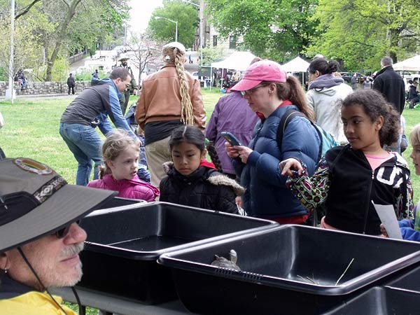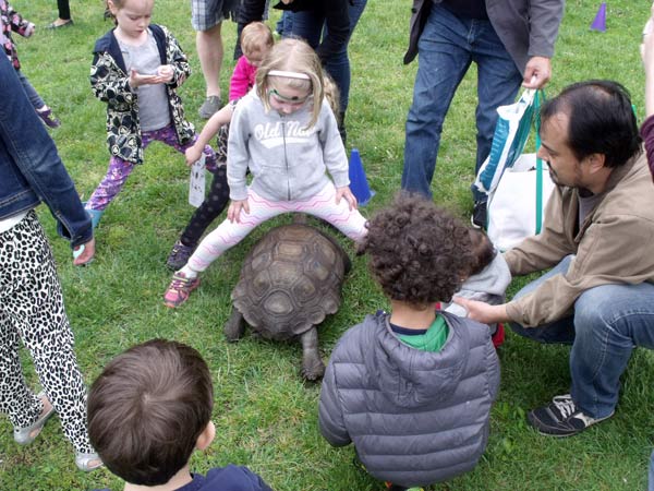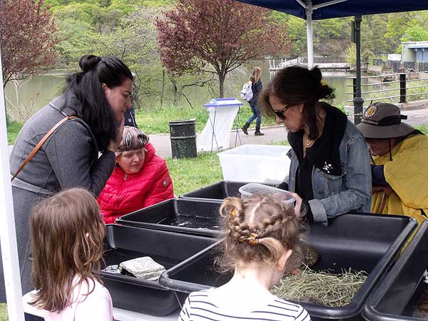 NYTTS Celebrated Urban Wildlife Appreciation Day for the Seventh Year. Held in Inwood Hill Park, Upper Manhattan, Saturday, May 7, 2016, The day was definitely chilly, overcast, and the wind coming over the Harlem River made us shiver. Had it not been for Matt Hybel rigging a plastic sheet barrier across the north side of our tent, we would have shivered throughout the day. Were there fewer people in the park than in previous years? Perhaps, but just as many curious people came to the NYTTS tent to see and ask about the turtles on display. Judith Barber, Lorri Cramer, Barbara Daddario, Suzanne Dohm, Matt Hybel, Andrea Ramsey, and Jim Van Abbema helped field turtle questions, and Judith and Andrea gave the kids turtle stamps for their cards. Native New York turtles on display included a diamondback terrapin, a common snapping turtle, a common musk turtle, a wood turtle, a spotted turtle, and an eastern box turtle. Out-of-state American turtles included an alligator snapping turtle, a three-toed box turtle, an ornate box turtle, a red-eared slider, and a yellow-bellied x red-eared slider. Non-native species included a South American red-footed tortoise, a Russian tortoise, and a Burmese brown mountain tortoise. The event is sponsored annually by the New York City Department of Parks & Recreation and the Urban Park Rangers. |